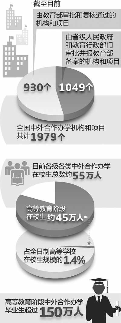 今年是我国《中外合作办学条例》颁布10周年,教育部在5日举行的新闻发布会上表示,截至目前,全国中外合作办学机构和项目共计1979个,高等教育阶段中外合作办学毕业生超过150万人。据介绍,教育部正在采取措施,清理规范中外合作办学项目、提升办学质量。如建立中外合作办学颁发境外学历学位认证平台,11月底前对于临近办学期的314个中外合作办学机构和项目进行合格性评估,治理未能依法合规正式在办的高中阶段涉外办学项目等。