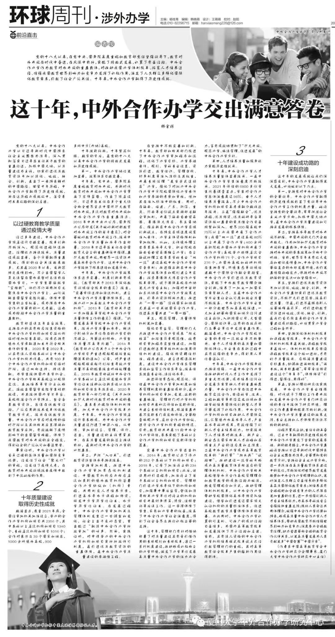 在全党、全社会喜迎党的二十大胜利召开之际,教育部机关报《中国教育报》安排大篇幅,发表厦门大学中外合作办学研究中心主任、中国高等教育学会中外合作办学研究分会理事长林金辉的文章《这十年,中外合作办学交出满意答卷》。今天发表的这篇文章,系统全面总结了党的十八大以来中外合作办学取得的历史性成就及其深刻启迪,具有重要参考意义和价值。