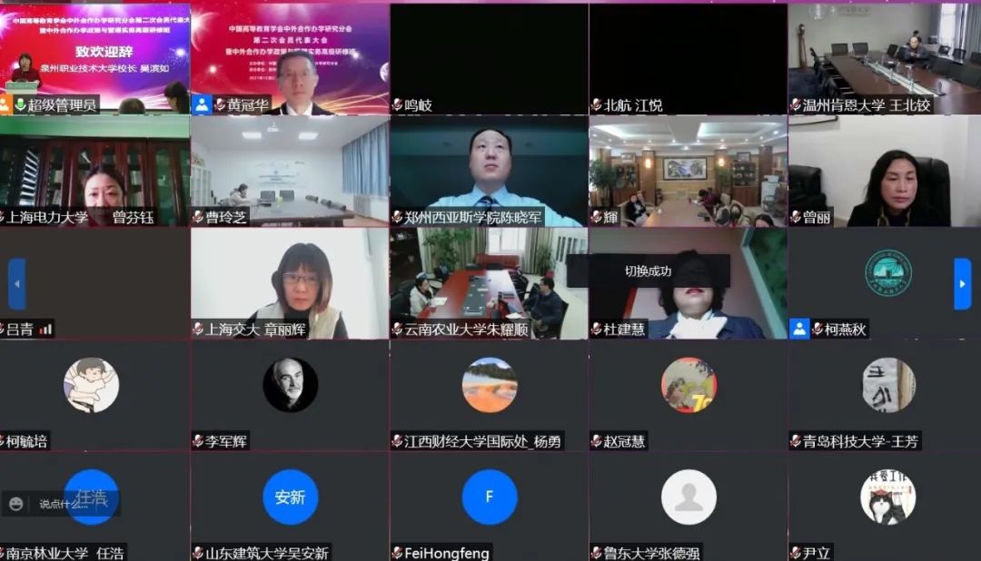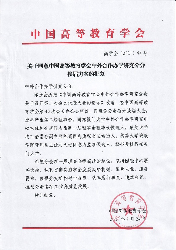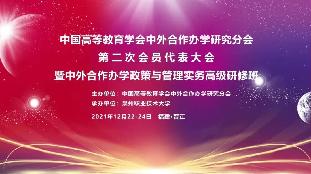 2021 年 12 月 22 日-24 日,中国高等教育学会中外合作办学研究分会(以下简称研究会)第二次会员代表大会在福建泉州隆重召开,选举研究会新一届理事会、监事,常务理事会、秘书长、副理事长和理事长。经选举,研究会创会理事长、厦门大学中外合作办学研究中心主任林金辉教授连任研究会第二届理事会理事长;中国高等教育学会中外合作办学研究分会主办的“全国中外合作办学政策与管理实务高级研修班”同期举行。