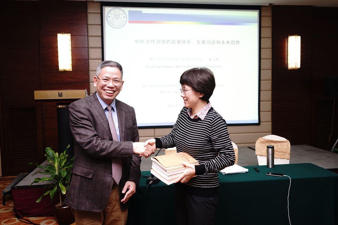 讲座开始前,林教授代表厦门大学中外合作办学研究中心向活动主办方赠送了近几年中心出版的《中外合作办学:政策、管理与质量保障》(上、下册)、《中外合作办学教育学》、《中外合作办学与高水平大学建设》、《中外合作办学质量建设研究》、《高等教育中外合作办学研究》等专著。