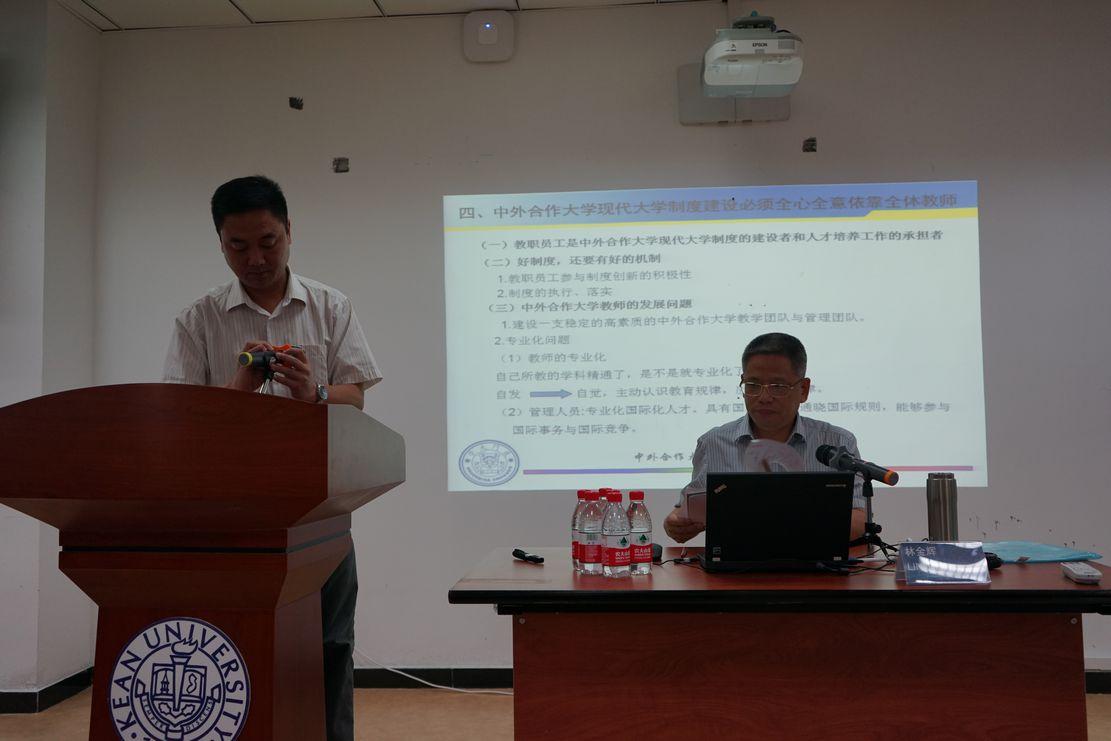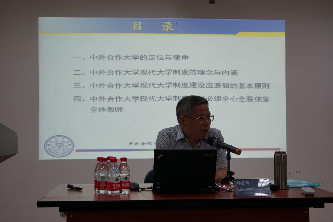 报告历时2个多小时,林主任分别从四个方面,结合中外合作大学的发展实际,紧扣学术前沿和政策走向,对中外合作大学现代大学制度的构建进行了深入浅出的分析。这4个方面分别是:中外合作大学的定位与使命、中外合作大学现代大学制度的理念与内涵、中外合作大学现代大学制度建设应遵循的基本原则、中外合作大学现代大学制度建设必须全心全意依靠全体教师。